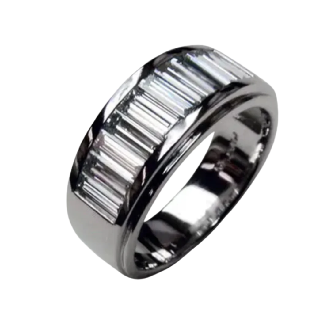 This men's platinum ring features a half eternity band set with matching baguette cut natural diamonds. The baguette cut diamonds add a sleek and modern look to this timeless and elegant piece. Perfect for special occasions or as a statement everyday piece.