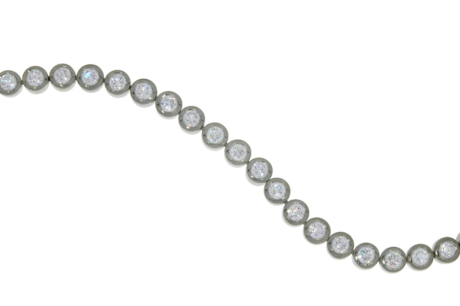 This elegant diamond bezel bracelet features natural round brilliant cut diamonds set in a sleek bezels. Handmade in 18kt white gold allowing for lots of movement, this bracelet is comfortable and perfect for adding a touch of sophistication and glamour to any outfit.