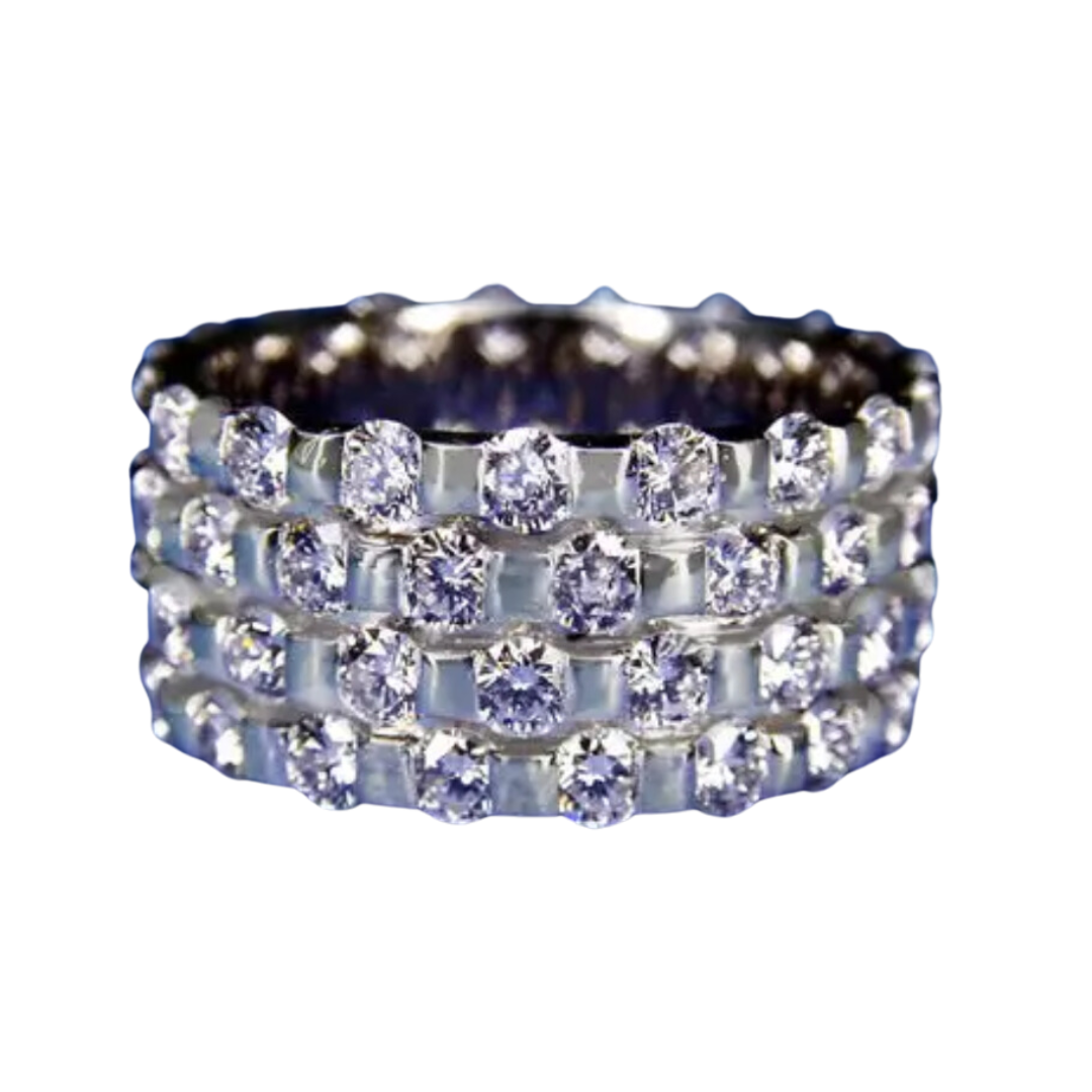 Expertly crafted in Platinum, this four row diamond eternity band is adorned with round brilliant cut diamonds. A timeless and elegant piece, perfect for symbolizing eternal love and commitment.