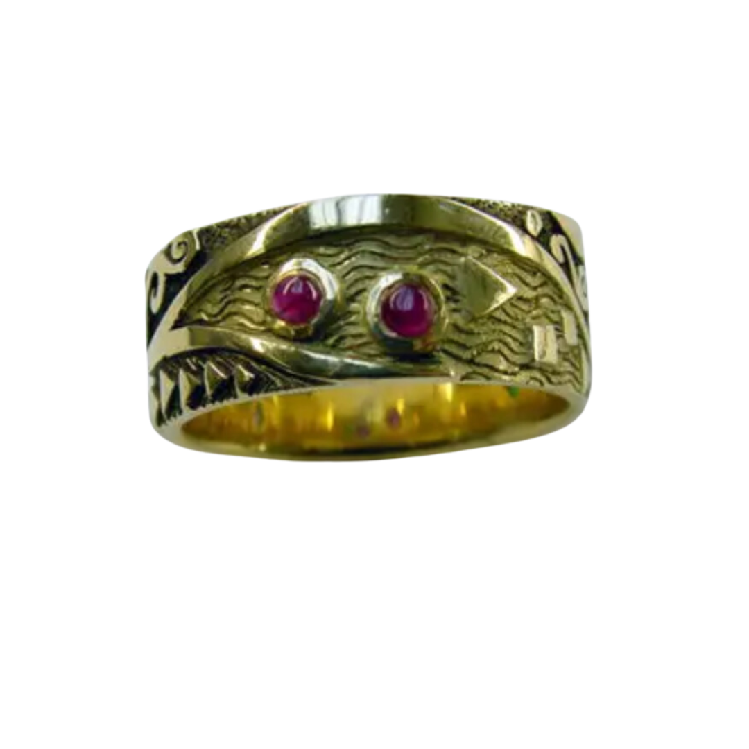 Inspired by the iconic painter Gustav Klimt, this band features a stunning combination of cabochon emerald, ruby and sapphire set in 18kt patinated yellow gold. Each gemstone adds a flash of color to the design, making this band a unique and eye-catching piece for any fine jewelry collection.