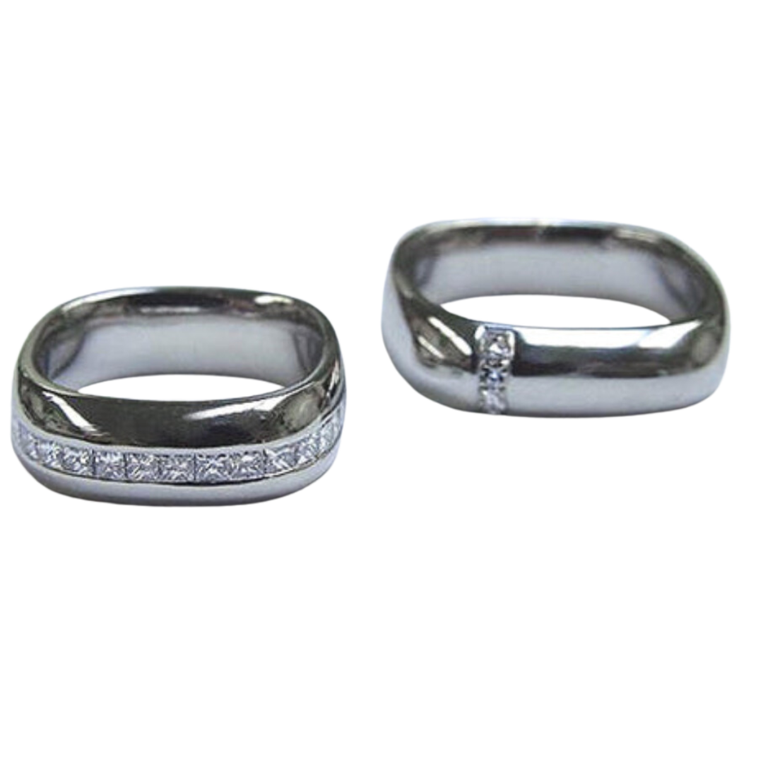 These uniquely shaped rounded square wedding bands are perfect for those looking for a sleek look. The wedding bands feature channel set princess cut natural diamonds, one in half eternity and the other with an offset channel, all set in platinum. Make your special day even more memorable with these stunning bands.