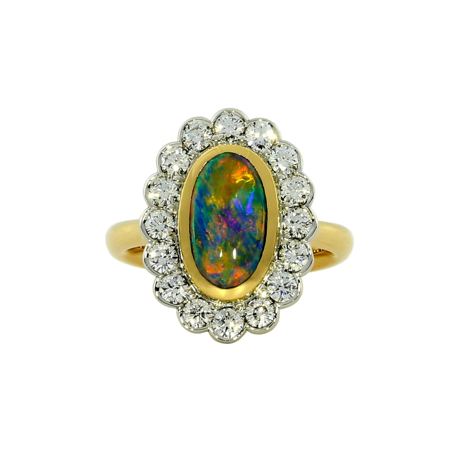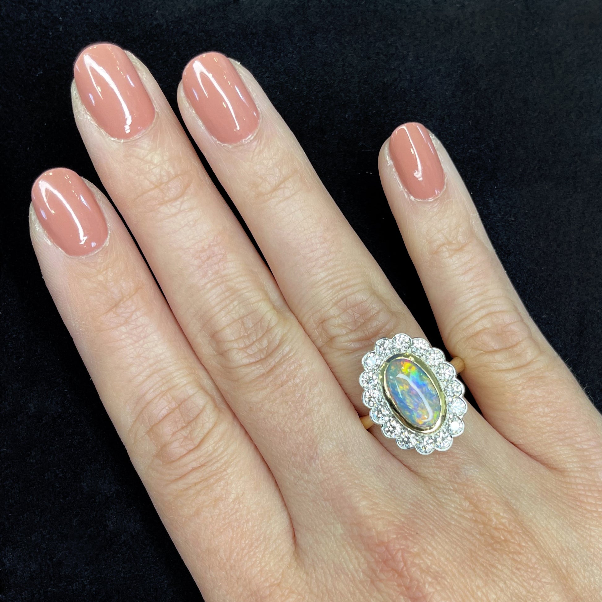 This stunning Lightning Ridge black opal and diamond ring is a true classic. The natural black opal is bezel set in 18kt yellow gold and is surrounded by natural round brilliant cut diamonds with a scalloped edge of platinum - all hand fabricated. As with every opal, this is a one-of-a-kind piece.