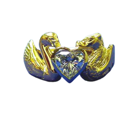 This handmade swan and dragon ring features a heart shaped cut diamond in 18kt yellow and white gold. Carefully carved swan and dragon are in perfect harmony sharing the heart.