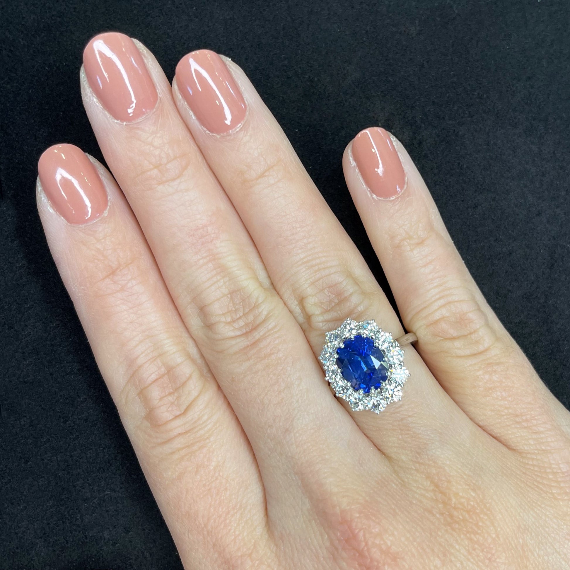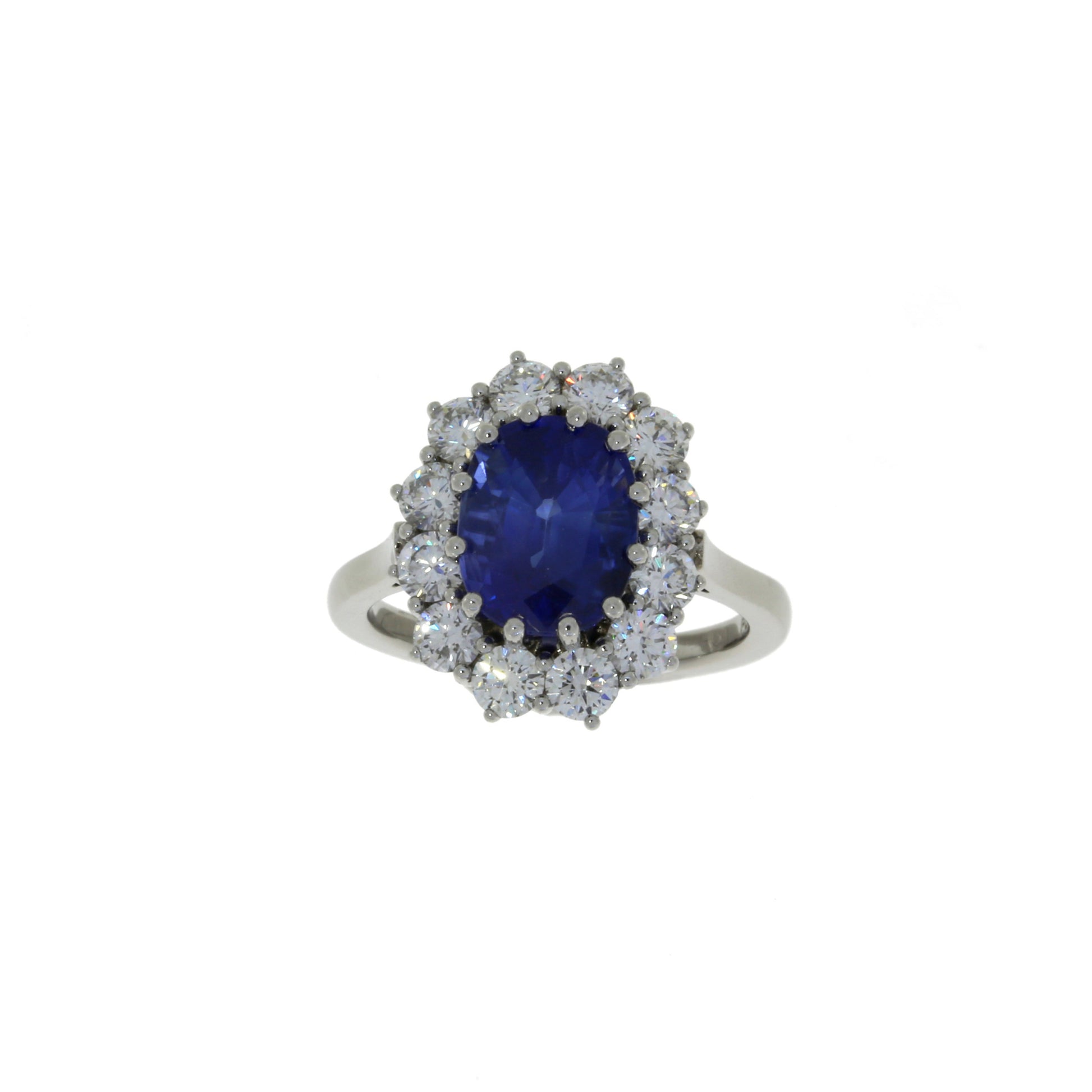 This very classic and traditional ring features a claw set natural oval cut blue sapphire, surrounded by natural round brilliant cut diamonds all set in platinum. As a sweet design touch, twelve claws hold the beautiful blue sapphire centre that is then surrounded by twelve round brilliant cut diamonds that are all claw set. Elevate your look with this stunning ring.