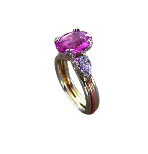 A twist on the classic three stone ring, combining a natural oval cut Sri Lanka pink sapphire in double pigeon claws, flanked by natural pear shaped diamonds set in platinum and 18kt rose gold. This beautiful combination creates a timeless and elegant design, perfect for any occasion.
