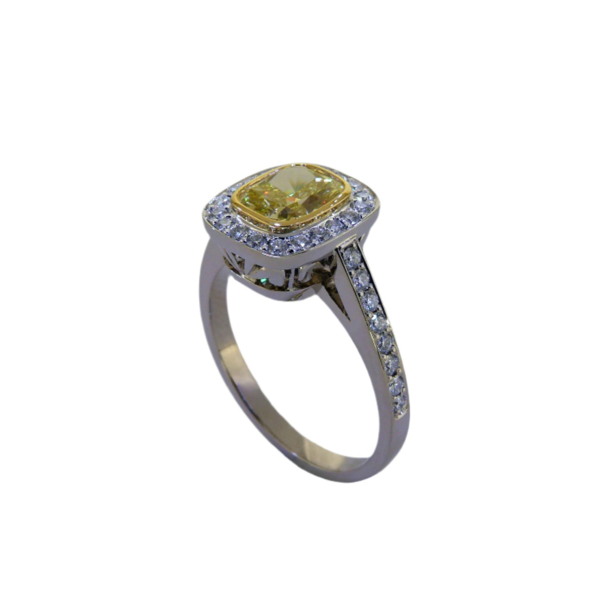 This diamond ring showcases a stunning natural fancy yellow cushion cut diamond at its centre bezel set in 18kt yellow gold, surrounded by natural round brilliant diamonds, and diamonds pave set half way down the shank all set in 18kt white gold. Handmade with precision, it is a perfect choice for those seeking a unique and beautiful piece of jewelry.