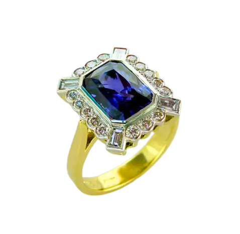 This exquisite ring features a stunning natural blue sapphire, known for its rarity and beauty, cut in an elegant emerald shape. The sapphire is accompanied by dazzling diamonds, set in a combination of platinum and 18kt yellow gold for a luxurious touch. Elevate any look with this timeless and sophisticated accessory.
