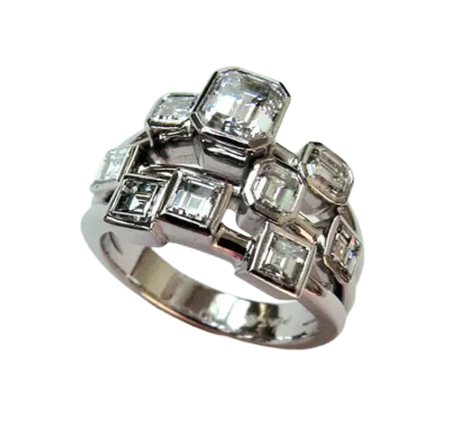 Discover the perfect blend of elegance and sophistication with our multi stone diamond ring. Showcasing a variety of emerald and carré cut natural diamonds, this ring sparkles with luxurious beauty. Made in platinum this ring is a timeless treasure to add to your collection.