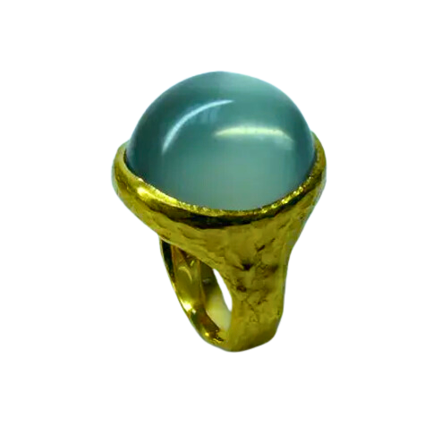 Handmade in 22kt yellow gold, this statement ring features a beautiful natural cabochon mango moonstone. Expertly bezel set to ensure its durability, it makes for an elegant addition to any collection.