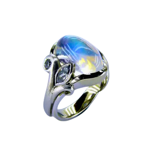With its stunning Art Nouveau design, this rainbow moonstone and diamond ring is a true statement piece. Featuring a brilliant, eye clean rainbow moonstone and natural marquise and round brilliant cut diamonds set in 18kt white gold, this ring exudes elegance and sophistication. Elevate any outfit with this beautiful gemstone and diamond combination.