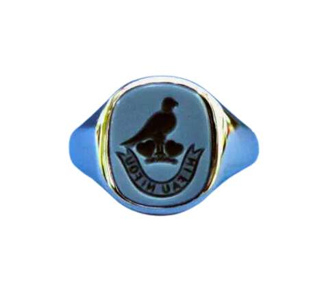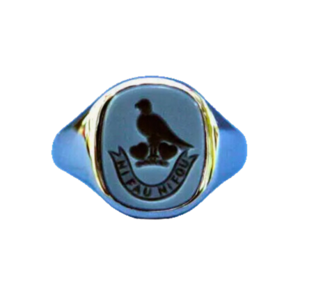 This family crest ring features a hand carved crest in layered blue-black agate, set in a stunning solid 18kt yellow signet ring. Its unique design showcases expert craftsmanship and timeless elegance. A perfect symbol of family heritage and tradition.
