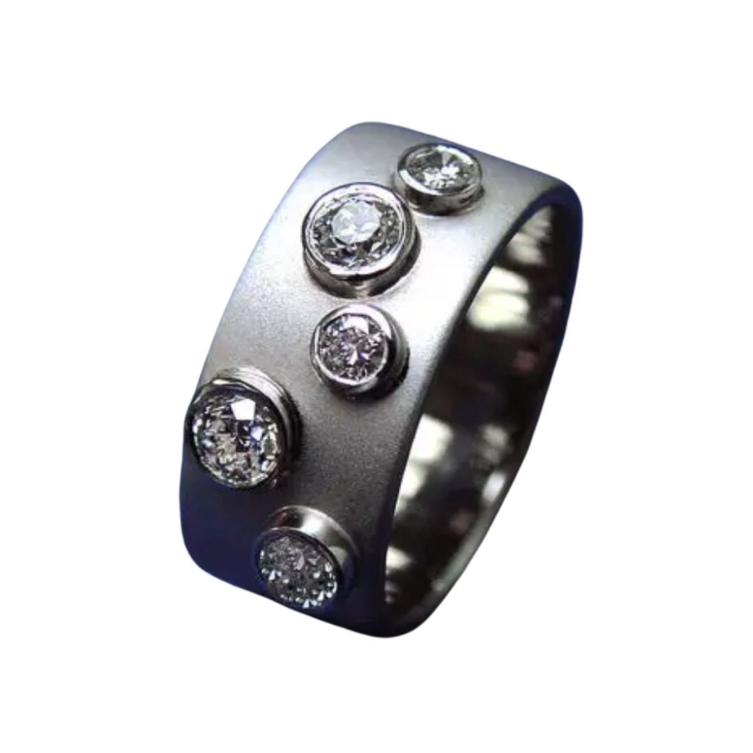 This band exudes elegance and sophistication. The wide flat brush finished 18kt white gold band showcases differing sizes of round brilliant cut natural diamonds bezel set sporadically. It is the perfect piece for any occasion or everyday.