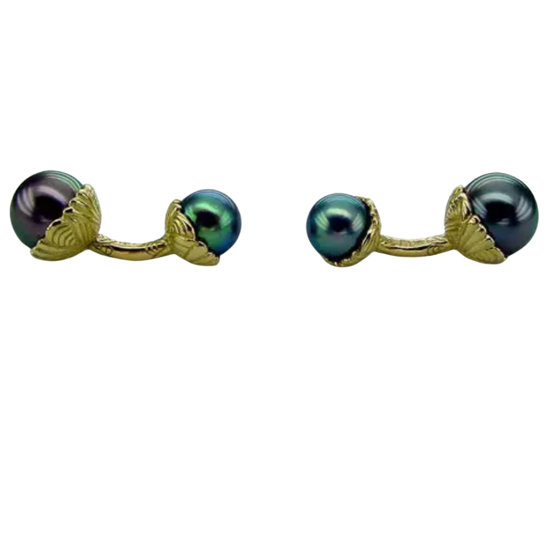 These handmade men's cufflinks feature two different sized Tahitian black pearls set in 18kt yellow gold. Double sided for versatility of wear, these cufflinks are a sophisticated addition to any formal attire.